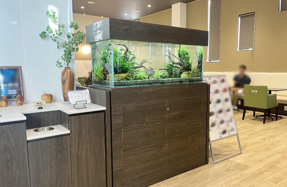 店舗の内装に合わせ、水槽台とキャノピー(上部カバー)は落ち着いた木目調に統一。水槽内の流木とも一体感があり、木のぬくもりを感じられるアクアリウムです。