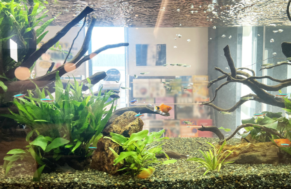 こちらの水槽は、『カージナルテトラ』や『アフリカンランプアイ』などの小型淡水熱帯魚を中心に導入しています。